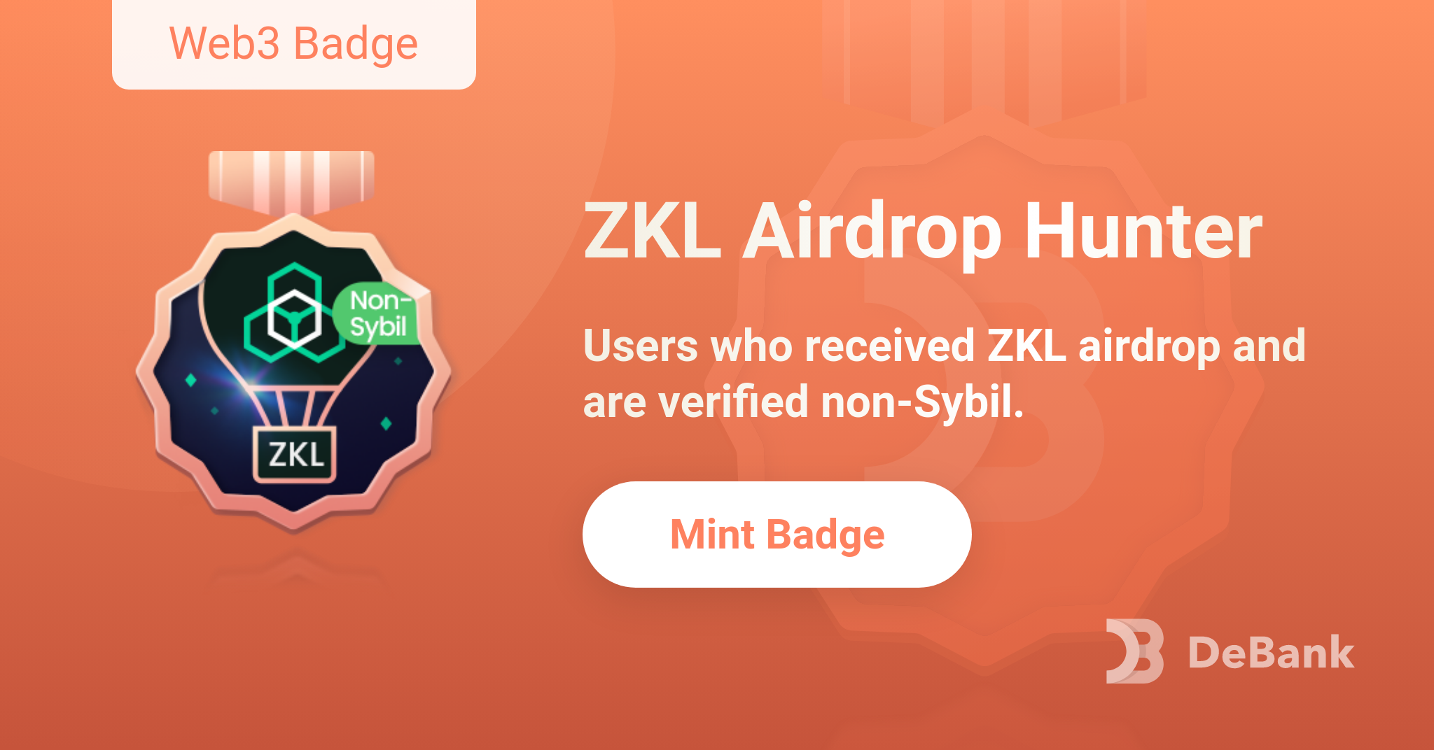 ZKL Airdrop Hunter: Users who received $ZKL airdrop and are verified non-Sybil can mint this badge.
